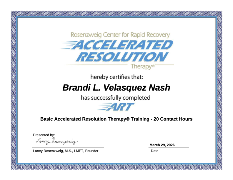 I’ve also attained my Certified Advanced Grief Counseling Specialist in 2024, as well as my certification in Basic Accelerated Resolution Therapy (ART). I often utilize ART to process grief, trauma, anxiety, depression, and many other mental health symptoms.